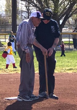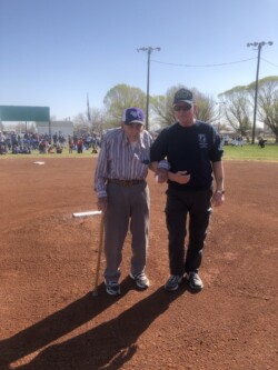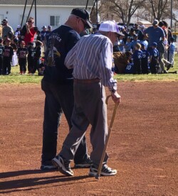 Alfred “Al” Bond, Quartermaster  of Veterans of Foreign Wars Post 8084 in Yerington escorted Babe Rodgers to the ceremonial pitcher’s mound to throw the first pitch.