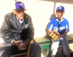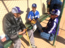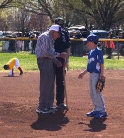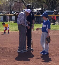 Babe Rodgers and Bryson Veil were able to talk together for a few minutes (about baseball, pitching & catching) after Jerry Bryant introduced them to each other in the dugout.