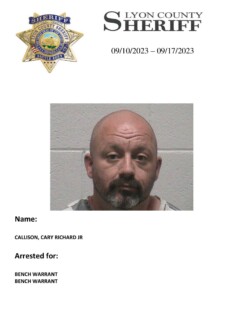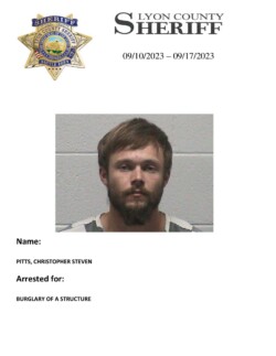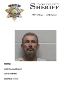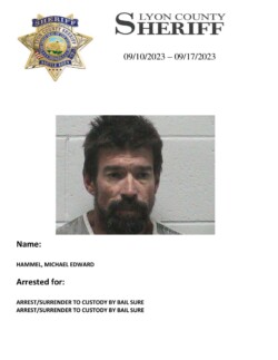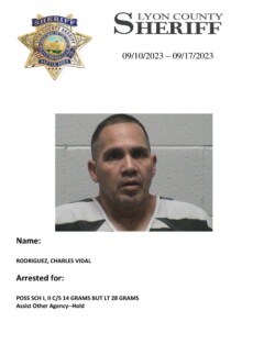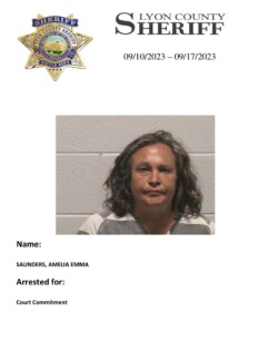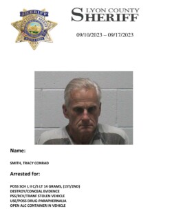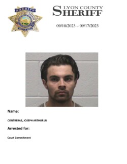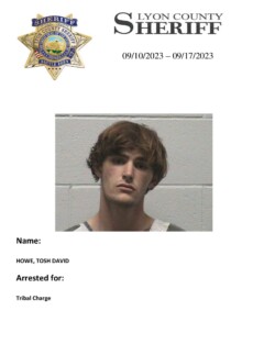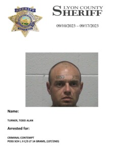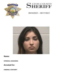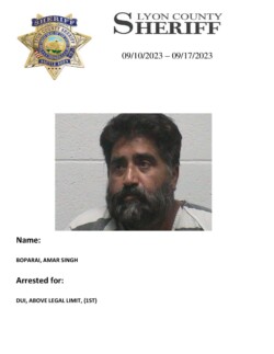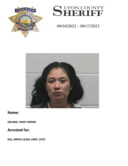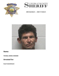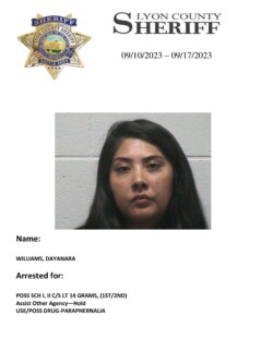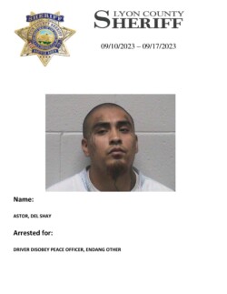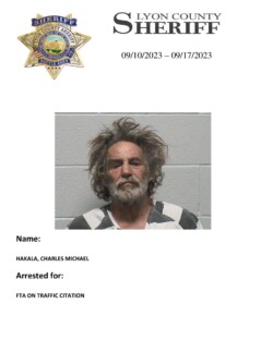 Lyon County, Nevada ~ For the week of September 10, 2023 through September 17, 2023, Lyon County Sheriff’s Office-Jail Division in Yerington recorded 24 bookings for Court Commitment; Driver disobeying peace officer, Endangering other; DUI, above legal limit; Bench warrants; Domestic battery; Resisting public officer; Criminal contempt; FTA Failure to Appear on Traffic Citation; Arrest/surrender to custody to bail surety; Tribal charge; Drug offenses; Open container in vehicle; Obtaining/use of another person’s identification; Burglary of a structure; Hold to assist other agency; Possessing, receiving or transferring stolen vehicle; Destroying/concealing evidence;