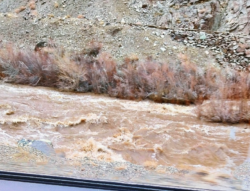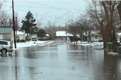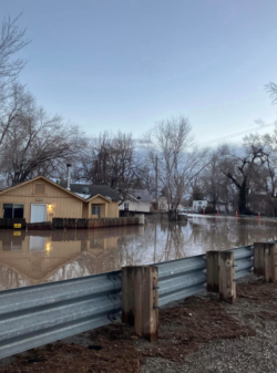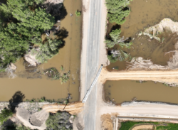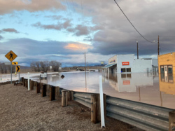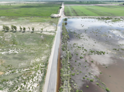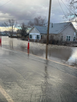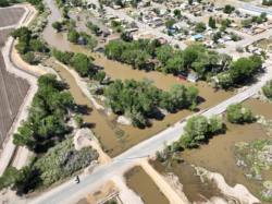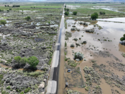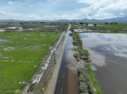 Walker River floodwaters at the corner of Miller Lane (left) and Aiazzi Lane (right) in Mason Valley, Nevada looking Northeast. Still photo from City of Yerington Public Works Department drone video on June 13, 2023.
