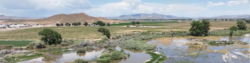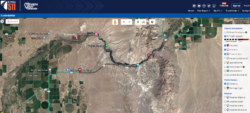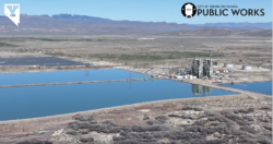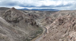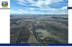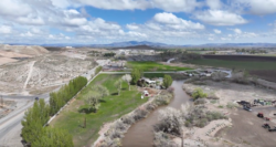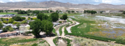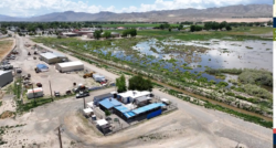 Looking Southwest: The Walker River Weir (a low dam built across the river to raise the level of water upstream or regulate its flow): at the 90 degree angle in the river. Anaconda ore piles on the upper right; Town of Yerington in upper middle with the airstrip from upper left toward middle. Singatse Mountain Range on the right; Pine Grove in the distant mid-left, with the white Sweetwaters peeking out between the two mountain ranges. Still photo from City of Yerington Public Works Department drone video on June 13, 2023.
