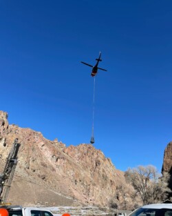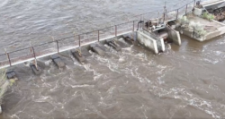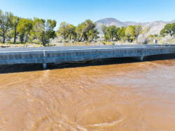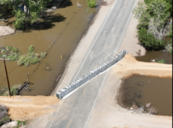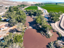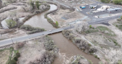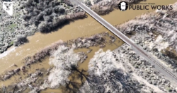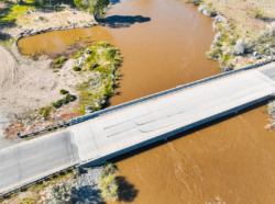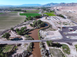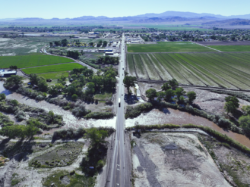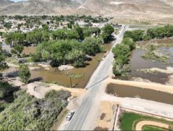Miller Lane Bridge: upriver on left flowing toward the right. Still photo from City of Yerington Public Works Department drone video on June 13, 2023.