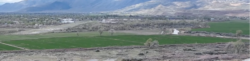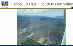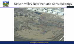 Mason Valley looking Southwest through flooded fields from the Miller Lane area toward McCloud Hill & Anaconda ore piles on the upper right; Town of Yerington in upper middle; Singatse Mountain Range on the right; Pine Grove in the distant middle, with the white Sweetwaters peeking out between the two mountain ranges; Mount Grant in distant left. Still photo from City of Yerington Public Works Department drone video on June 13, 2023.
