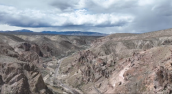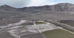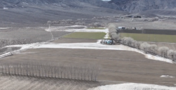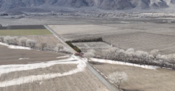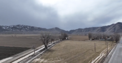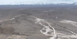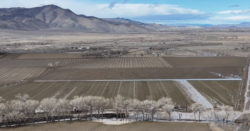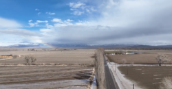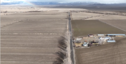 Looking West toward Singatse Mountain Range with snow-capped Pine Nut Range in the distance: Miller Lane in Mason Valley, Nevada: South side of Miller on the left, North on the right. Still photo from City of Yerington Public Works Department drone video on June 13, 2023.