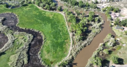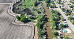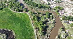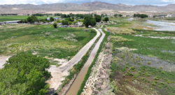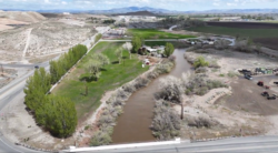 The Weir is located downriver from Goldfield Avenue, but before the Miller Lane Bridge. Still photo from City of Yerington Public Works Department drone video on June 13, 2023.
