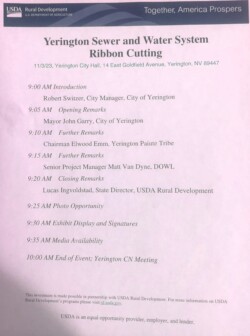 DOWL Engineering in Reno designed the new water and sewer system. Q&D Construction dug up the old water and sewer lines and assembled the new system. The USDA (United States Department of Agriculture) Rural Development made arrangements for federal payment for the major portion of the project’s cost which totaled $44 million. City of Yerington and the Yerington Paiute Tribe partnered in advocating for this extensive project.