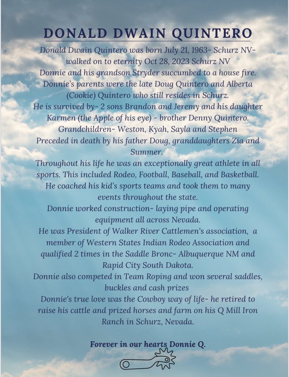 Donnie was born at the Schurz Indian Hospital in Schurz, Nevada to Douglas Dean Quintero, Sr. and Alberta (Cookie) Hicks Quintero on July 21, 1963. Donnie was welcomed by big brother Douglas Dean (Denny) Quintero, Jr. He was a member of the Walker River Paiute Tribe.