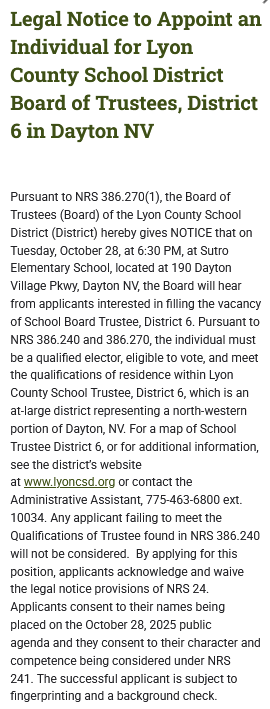The Lyon County School District Board of Trustees will invite interested members of District 6 in Dayton, NV to apply for the vacant Trustee seat. In accordance with Nevada Revised Statutes 386.270, the Board will publicize the vacancy once each week for 2 weeks.