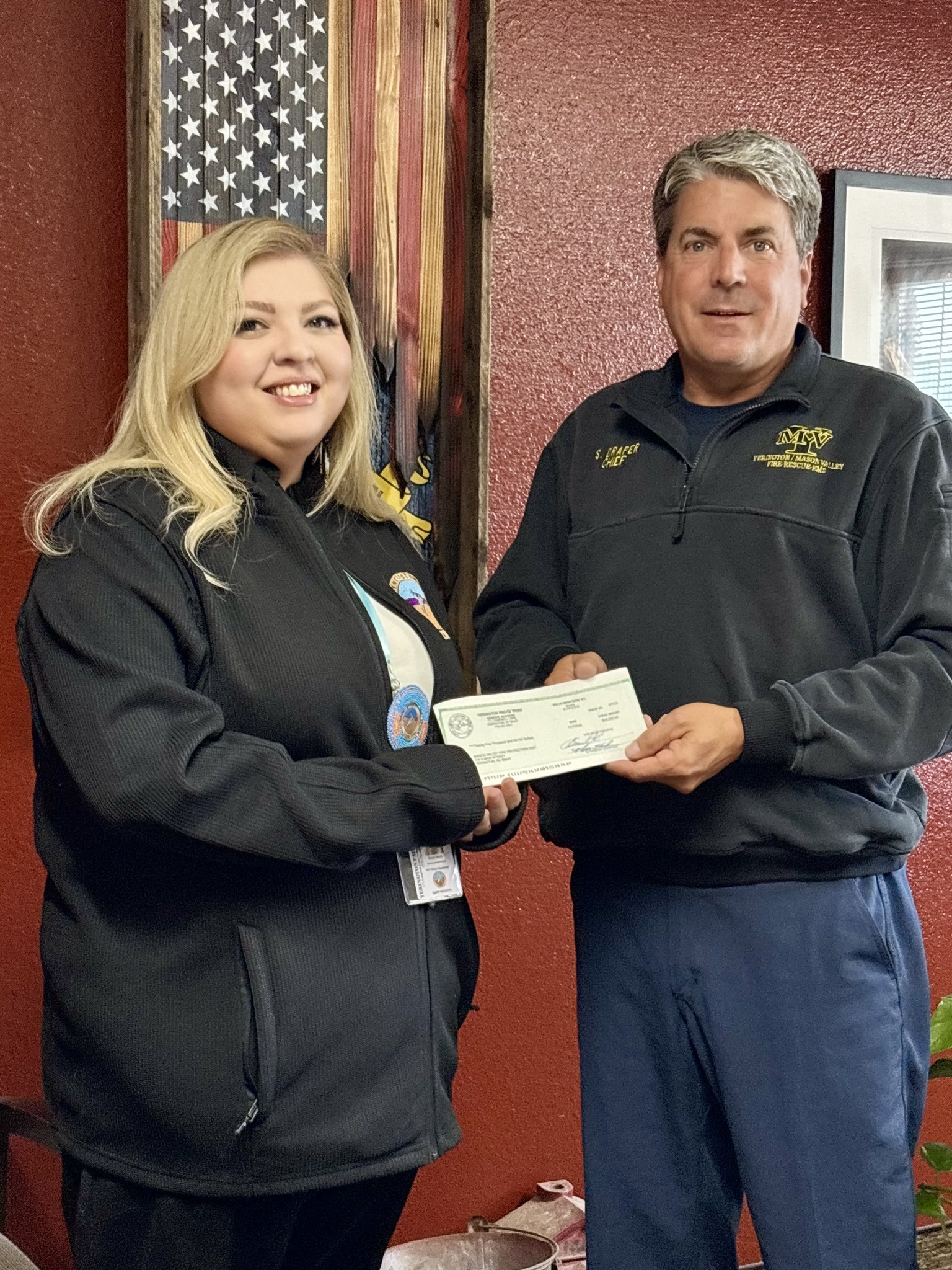 Yerington Paiute Tribe Chairman Ginny Hatch presenting the $25,000 donation check from the Yerington Paiute Tribe to Yerington/Mason Valley Fire Protection District Chief Scott Draper. This donation is to contribute towards the purchase of the YMVFPD’s new Ladder/Fire Truck.