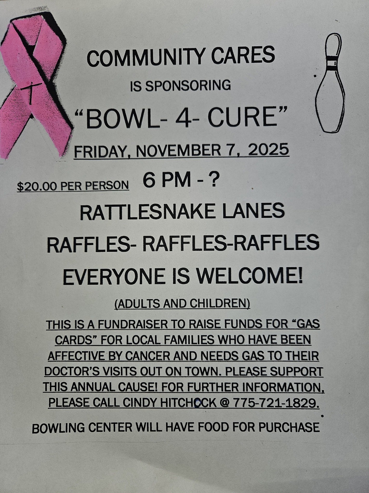 Cindy Hitchcock also wrote that: …”during October 15th – November 15th, that South Lyon Medical Center had a raffle of items that the staff and employees could win, and raised $600.00 for ” Bowl 4 a Cure”. The event night on November 7, with bowling and more raffles raised $1800.00. All monies raised stay here in our community and will help local people to get to go to their appointments for treatments. Thank you to everyone that supported this event. Especially Rattlesnake Lanes for the use of their center.”