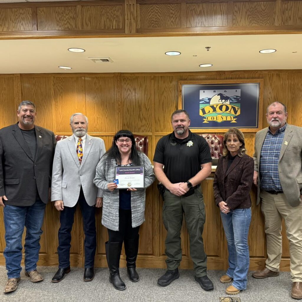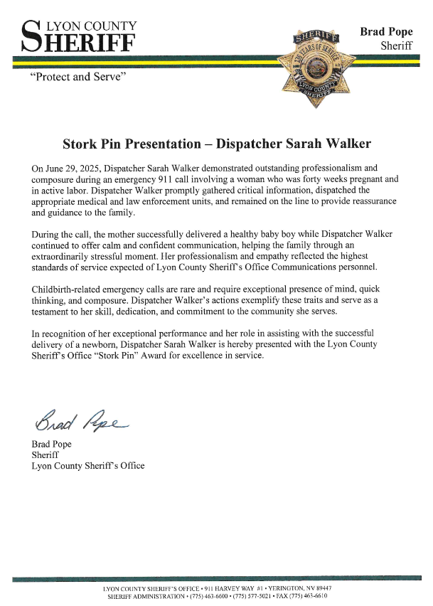 Lyon County Sheriff Brad Pope reported: “We are honored to have recognized Public Safety Communications Dispatcher Sarah Walker at this morning’s Board of County Commissioners Meeting. She was awarded the Lyon County Sheriff’s Office Stork Pin for her exceptional performance and critical role in assisting with the successful delivery of a newborn. Congratulations, Dispatcher Walker, and thank you for your outstanding service to our community!”