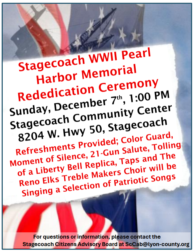 Stagecoach, Nevada – The Lyon County Stagecoach Citizen Advisory Board would like to welcome everyone to a World War II Pearl Harbor Memorial Re-dedication Ceremony and USS Nevada Remembrance on Sunday, December 7th, 1:00 PM. Stagecoach Community Center (also called the old fire station), 8204 W. Hwy 50 in Stagecoach. We will come together to honor and remember those who sacrificed their lives and left a lasting legacy and remember the USS Nevada, BB-36.