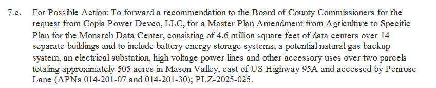 On August 7, 2025 at a Board of County Commissioner meeting Copia Power DevCo, LLC presented it’s application to change 505 acres FROM Rural Residential 20 acre lot minimum/Agriculture TO “Specific Plan” Zoning for their proposed Monarch Data Center. Thirteen members of the public spoke at the meeting AGAINST the Master Plan Rezoning and four members of the public spoke FOR the Master Plan Rezoning. The Board of County Commissioners chose to table the request to a future date. https://www.youtube.com/watch?v=-uBXZEsM2xg&t=35s (begins at 1:40:58)