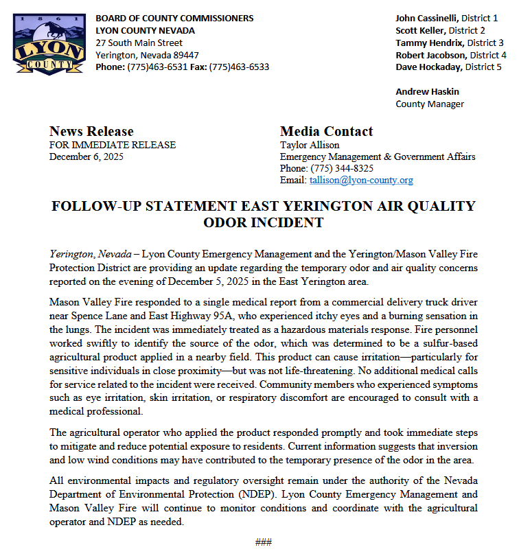 Follow-up Statement East Yerington Air Quality Odor Incident