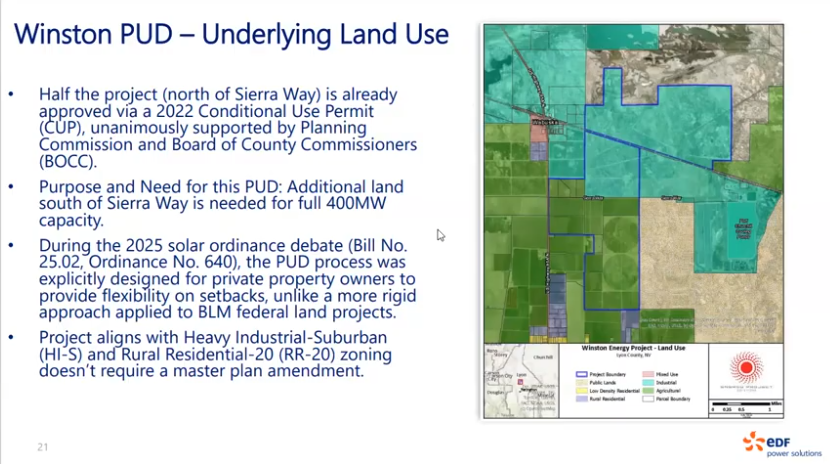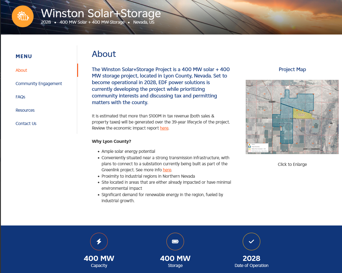 On December 9, 2025, the Lyon County Planning Commission convened in the Lyon County Commissioners Meeting Room in Yerington NV for an agenda including a plan for the Winston Solar + Battery Energy Storage System Project . Watch from 22:20 to 2:35:18. https://www.youtube.com/watch?v=peslreAA2RA