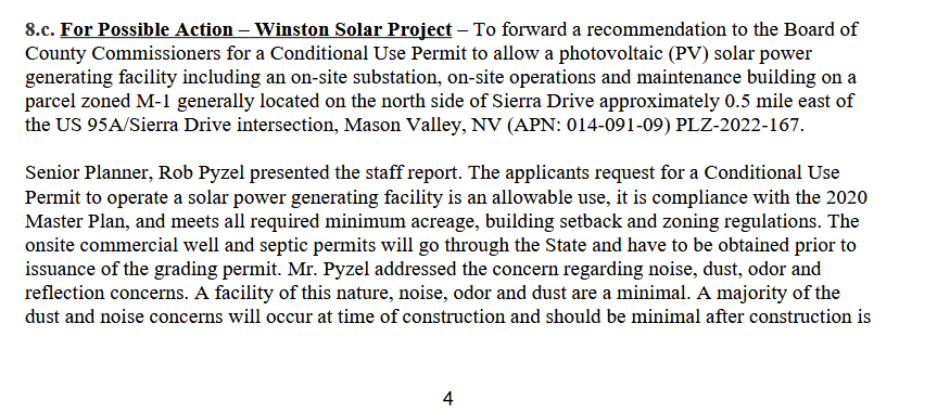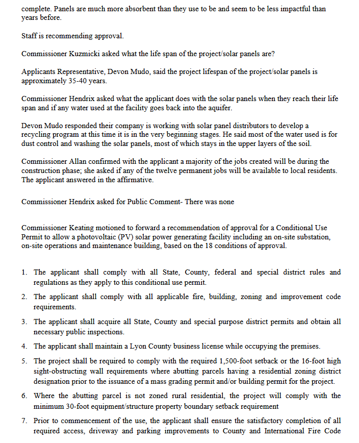 Notes from the 2 hour 12 minute Lyon County Planning Commission Hearing on the proposed Winston Solar & Battery Storage Facility in Mason Valley, Nevada: