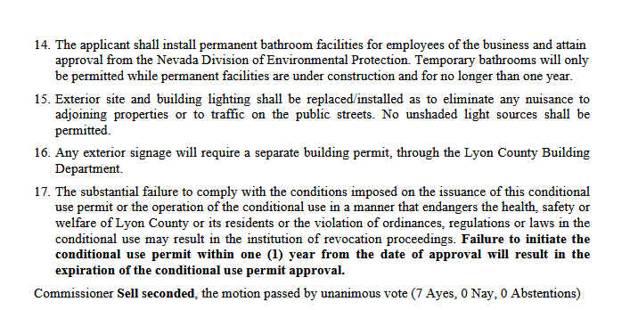 Scott Whittemore reiterated that they are asking the board to put conditions on them for approval. He pointed out that staff’s recommendation for approval included a condition to “go get an approved TIS Traffic Impact Study.” He mentioned that NDOT Nevada Department of Transportation is saying they will “expedite” the process, hopefully taking less than a month, but this doesn’t solve their immediate timeline crunch.