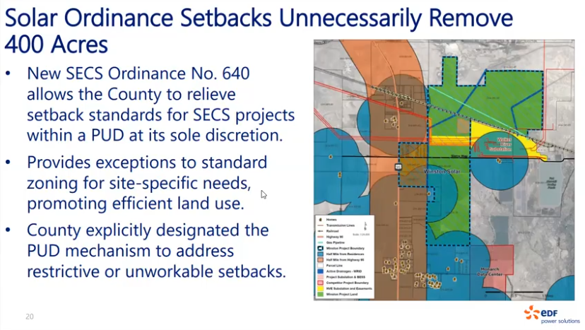 Commissioner Loomis addressed Scott Whittemore directly, acknowledging the project’s long history since 2017 and the significant investments made. He asked for a definitive answer on whether the project would be “negated” entirely if EDF could not obtain the necessary deviations for the 400 acres currently assigned for setbacks. Scott Whittemore answered that the project would not be completely negated, but it would be reduced to a smaller size, making it less economically viable and complicating ongoing negotiations with potential off-takers like NV Energy, whose interest is currently geared toward a 400-megawatt project.
