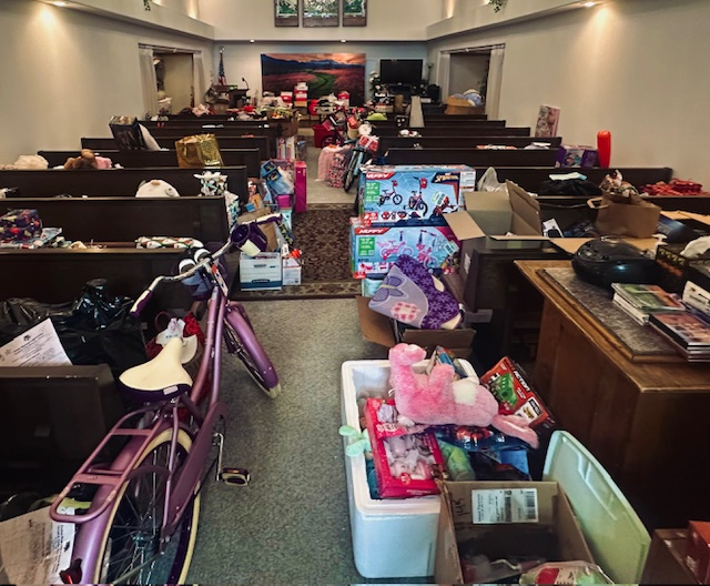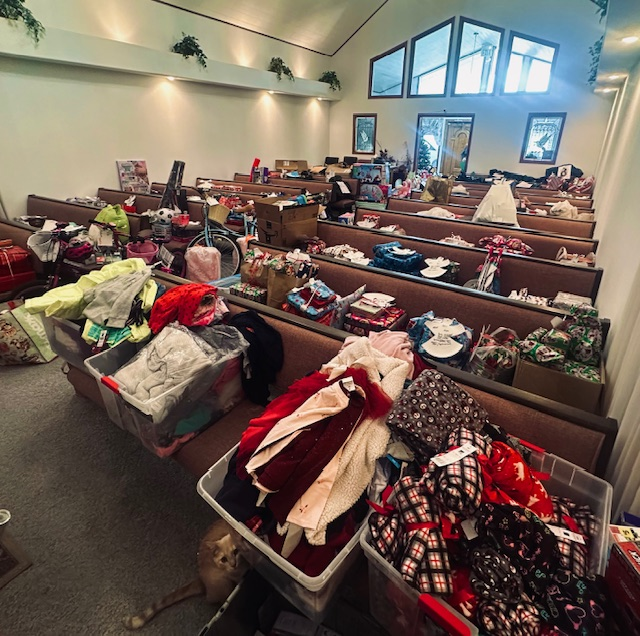 When we arrived to drop off presents, the entire funeral home was filled with gifts. Boxes stacked in rooms and hallways. Bicycles leaned against pews. Tables covered in toys and clothes. Cindy and a volunteer were wrapping presents, moving through it all with ease and joy. It was a sight that could bring tears to anyone’s eyes.