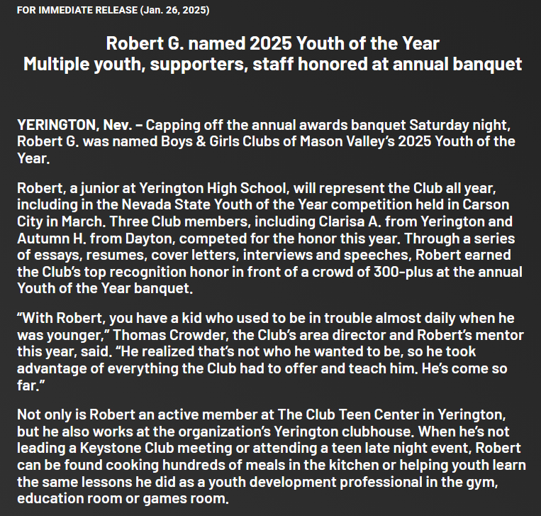 He was a lifelong resident of Yerington, attended Yerington High School and was a member of the Yerington High School Band where he played the clarinet and guitar. Robert enjoyed being with his family & friends and loved working at the Boys & Girls Club and at the movie theatre. His hobbies included Lego building, fishing, camping, swimming, off-roading or cruising in his truck, cornhole, bowling, shooting guns, playing his PlayStation 5, and just hanging out.