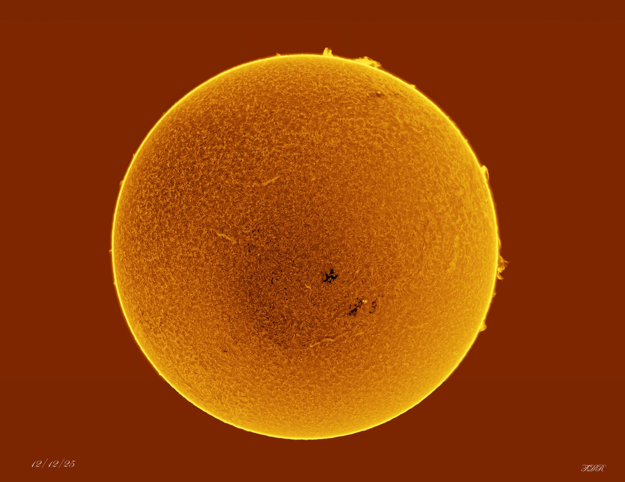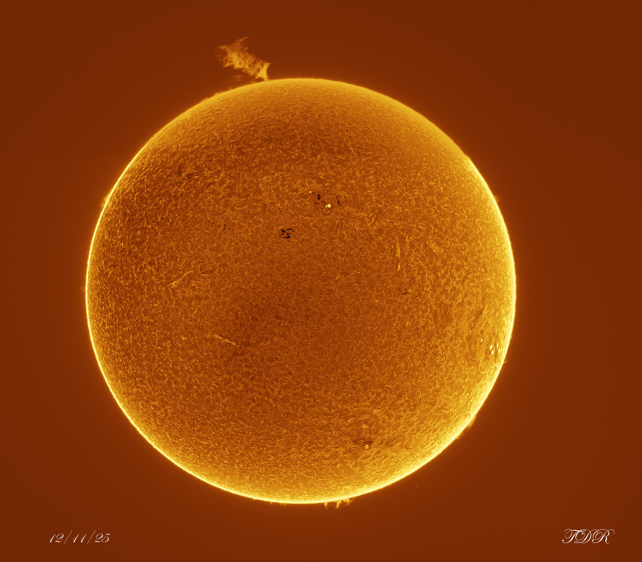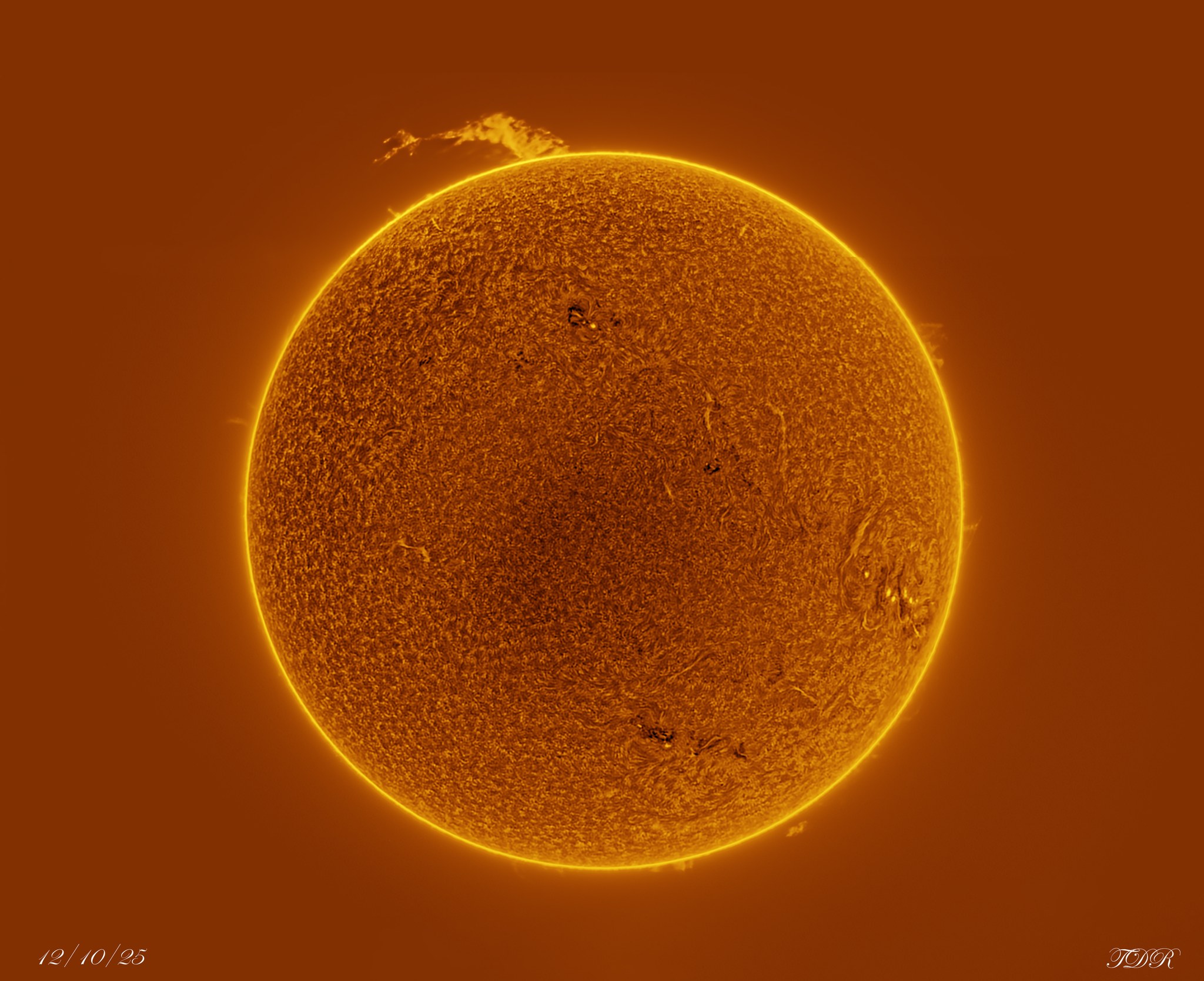 On December 15, 2025 Terri wrote: “Last Wednesday, conditions were favorable for solar photography. To our amazement, there was an absolutely HUGE prominence emitting from the top of the sun! This was about a hundred thousand miles in size! We were lucky enough on the next two days to see how it changed as time passed. It was too slow moving, and we didn’t have time for a time lapse, but we caught these three images, each 24 hours later than the former. It was really cool to see how it changed!”