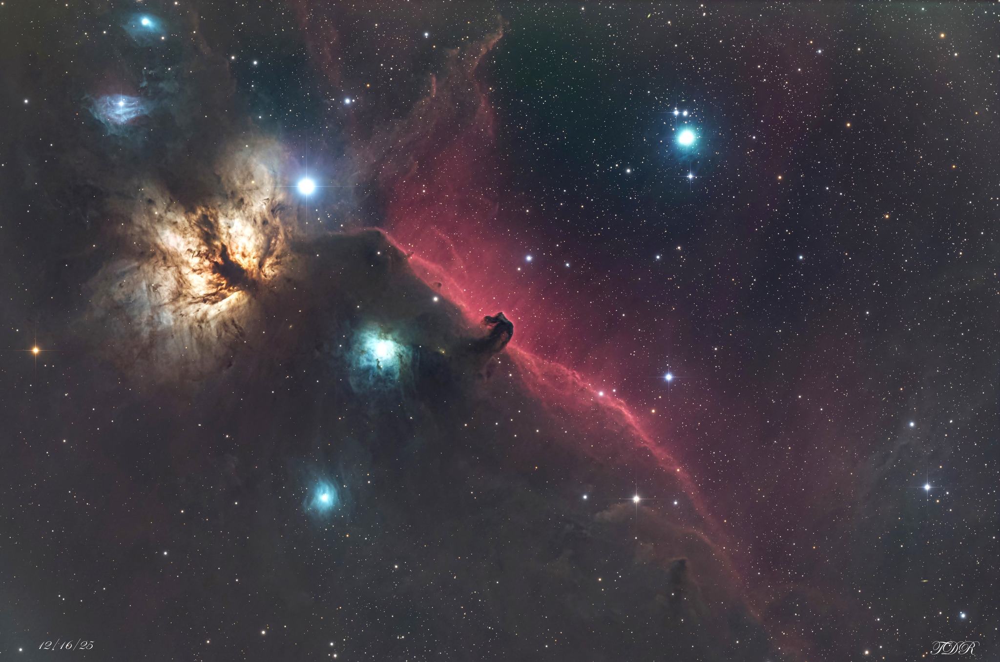 The Horsehead Nebula and Flame Nebula are two of the most iconic deep-sky objects in the night sky, located approximately 1,300 to 1,500 light-years away in the constellation Orion. They sit just south of the star, Alnitak, the easternmost star in Orion’s Belt.