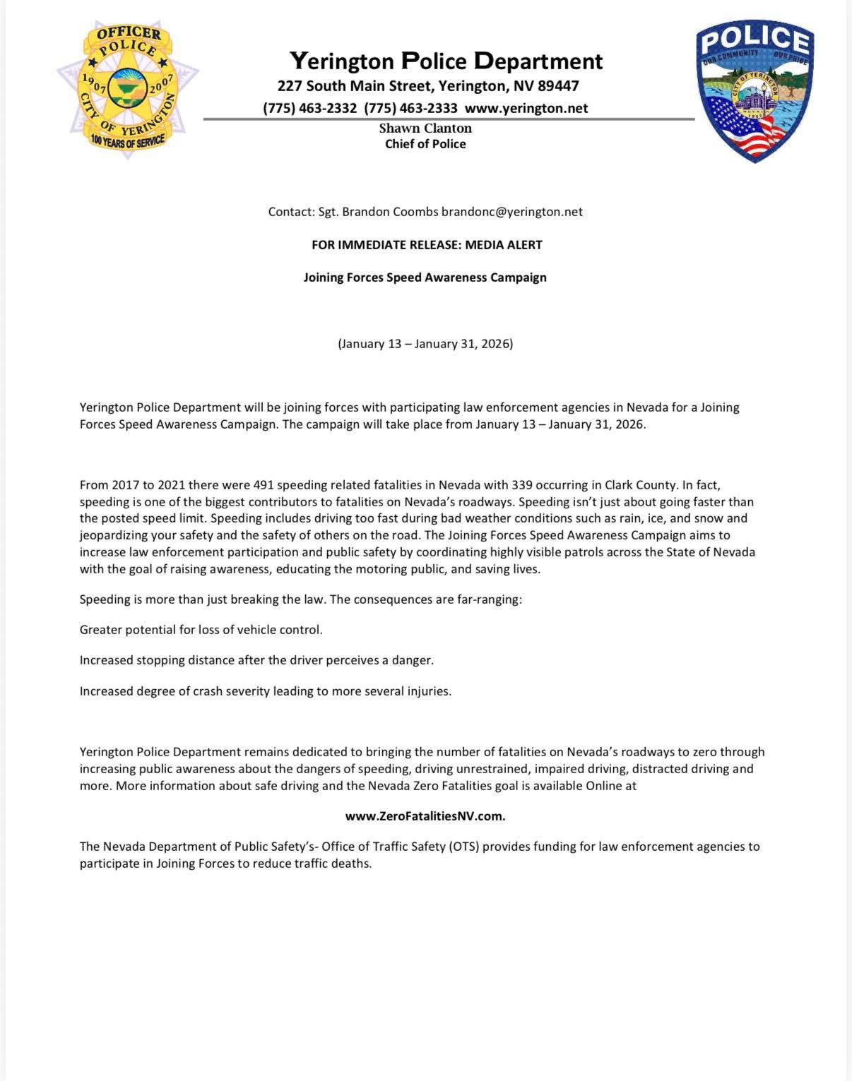Speaking of safety, this is a great time to remind you of the Speed Awareness Campaign that is ongoing with Yerington Police Department and several other agencies. Speeding is one of the biggest contributors of to fatalities on Nevada roadways. While this campaign officially has an end date of January 31, 2026, please know that speeding is not any safer on February 1, 2026 and will be enforced the same.