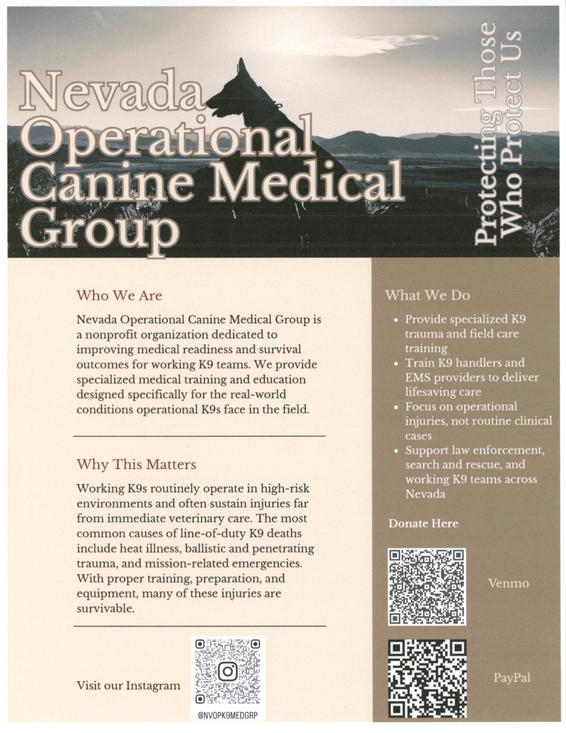 Nevada Operational Canine Medical Group is a newly established nonprofit organization dedicated to improving medical readiness and survival outcomes for working K9 teams. With strong community support, the group provides specialized medical training and education tailored to the real-world conditions operational K9s face in the field.
