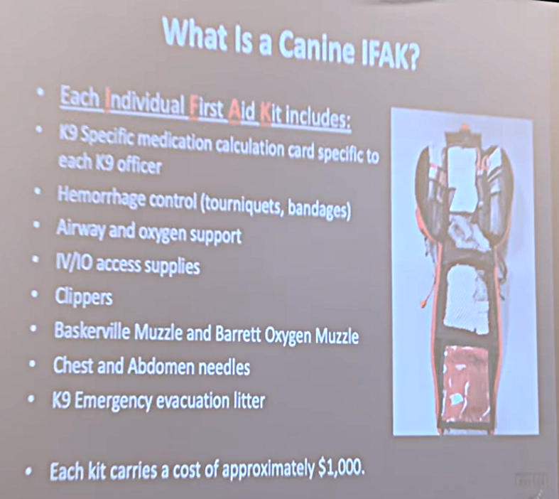 Dr. McConnell provides regular testing & veterinary oversight on the Nevada Working K9s. Each IFAK has specific medication amount lists, emergency veterinarian contacts, and Narcan for each individual K9 officer. K9 Handlers and their agencies, including law-enforcement, emergency medicine, fire departments, and air ambulances will be trained in trauma procedures for Nevada’s working K9s.