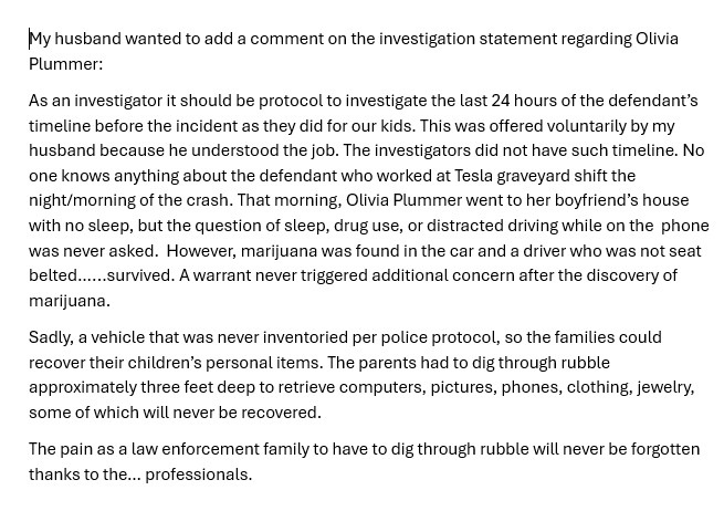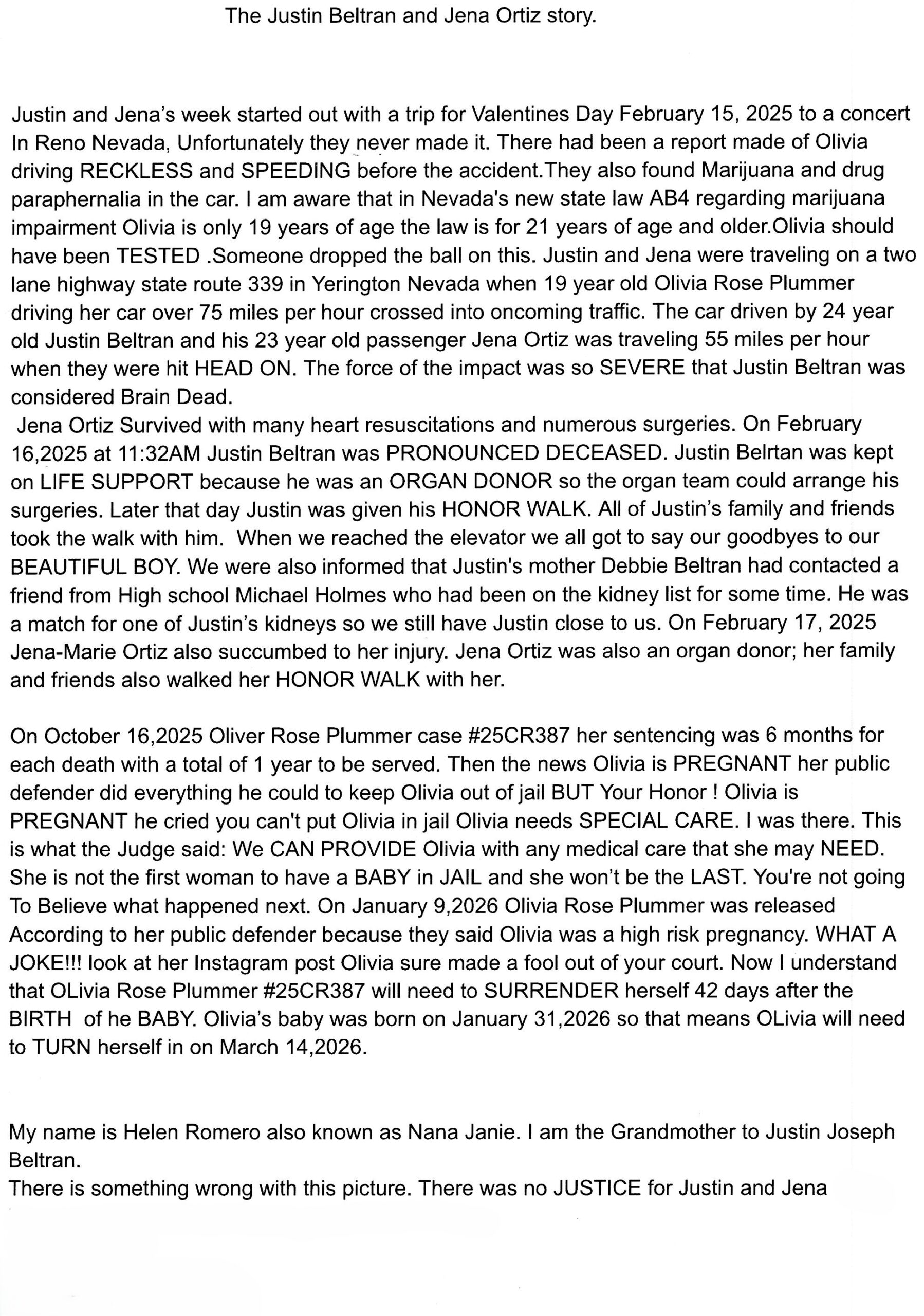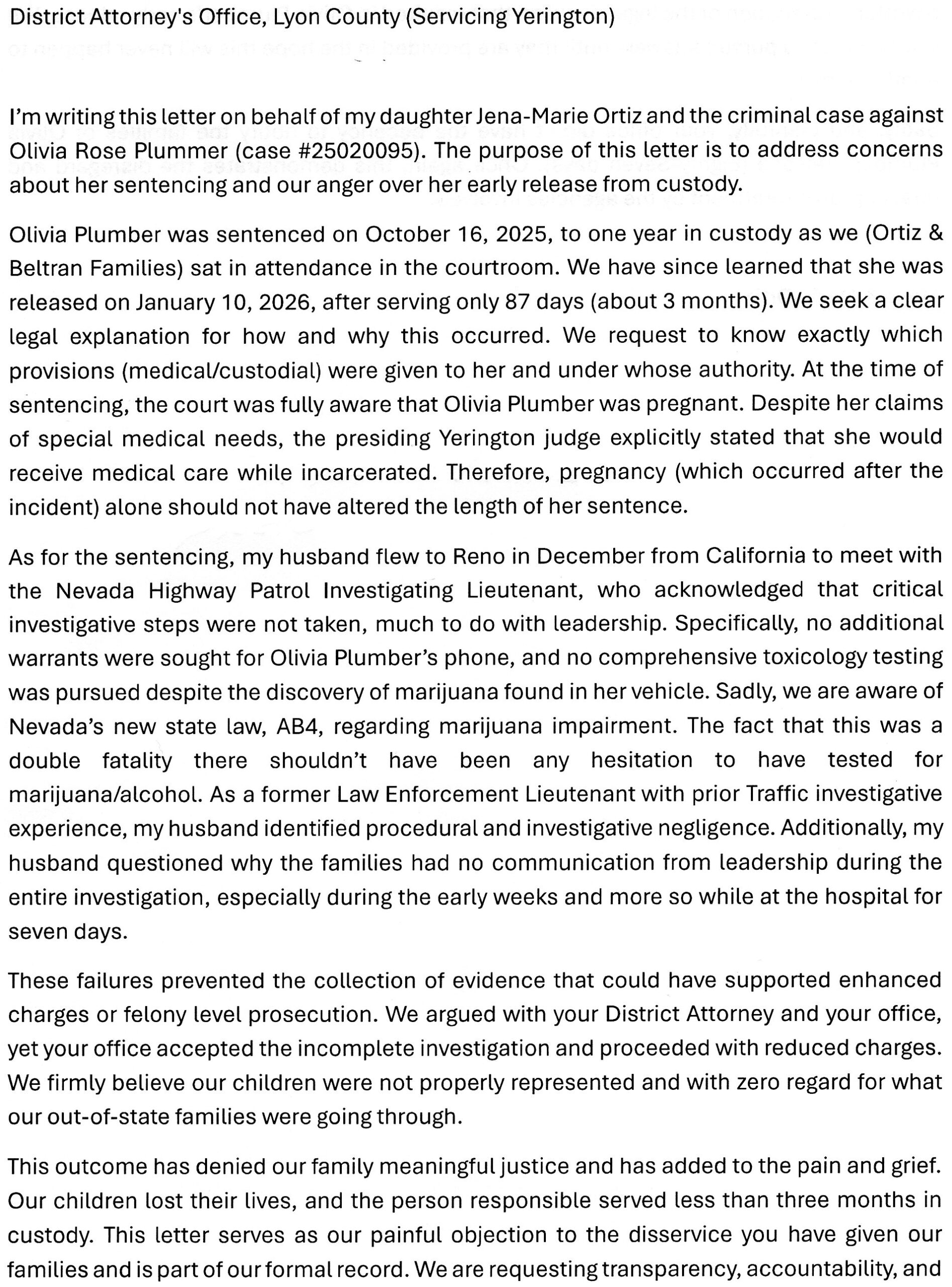 The Beltran & Ortiz Families attended sentencing for Olivia Plummer in Yerington on October 16, 2025 as she was sentenced to 1 year in jail. The families were shocked to learn that 87 days later Olivia was released from jail on January 10, 2026. Families of Justin Beltran & Jena Ortiz believe an incomplete investigation (including lack of thorough toxicology testing for marijuana/alcohol) appears to have contributed to eventual reduced charges for Plummer.