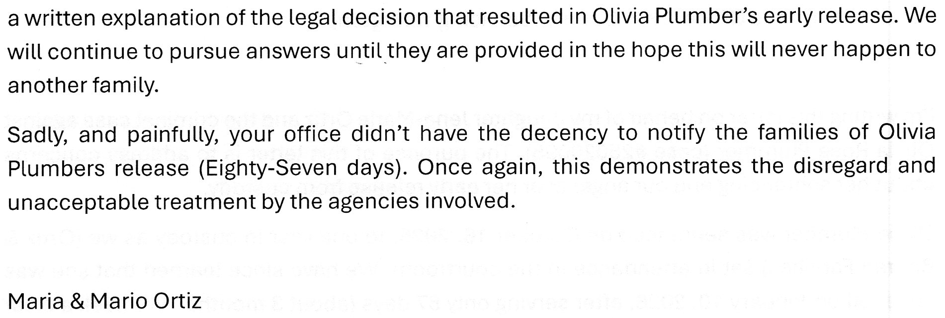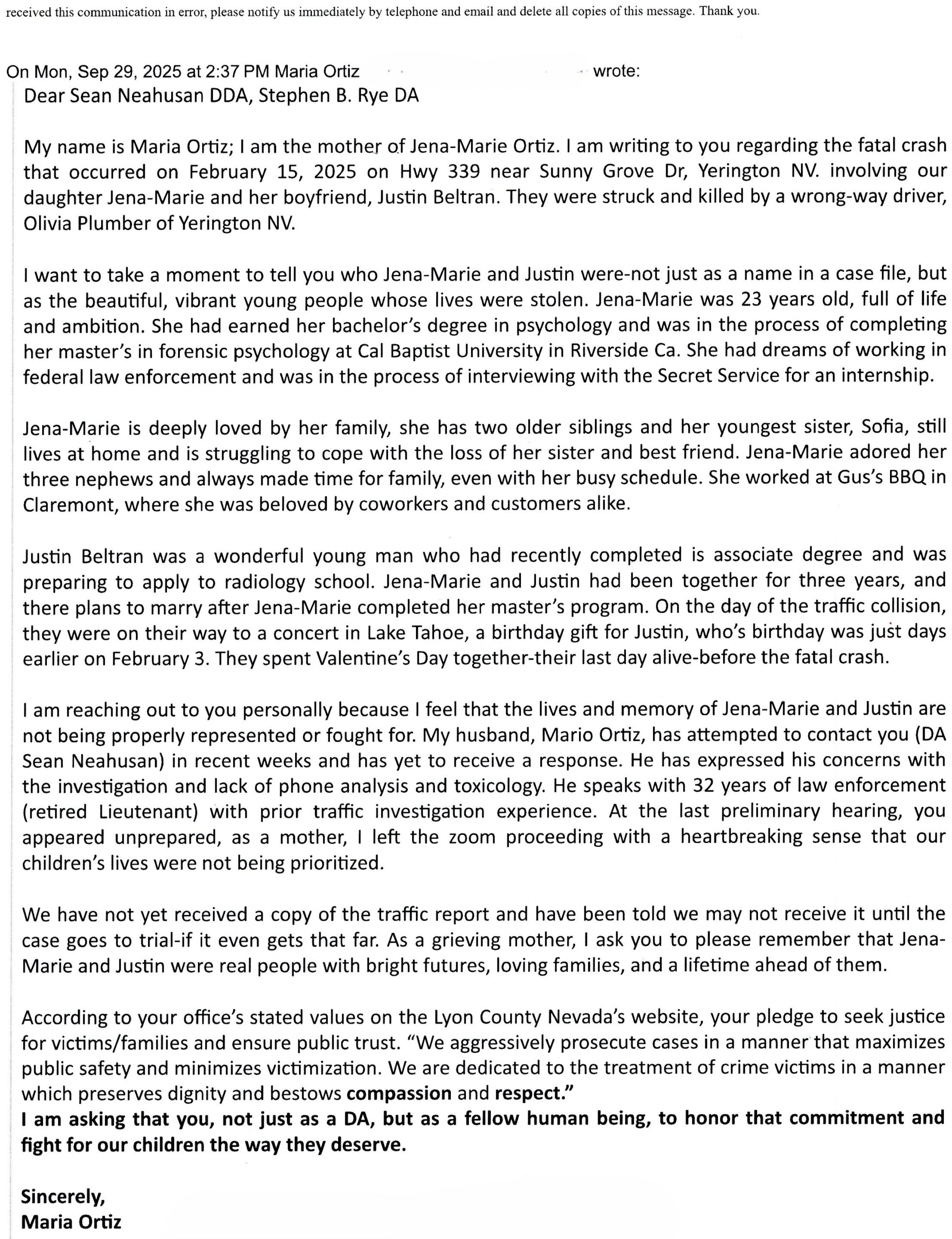 Jena-Marie Ortiz’s parents, Maria & Mario Ortiz, wrote to the Lyon County District Attorney in 2026: