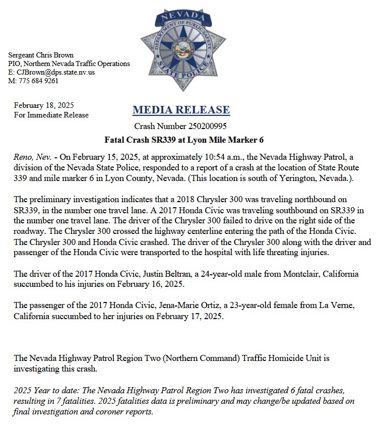 Nevada State Police determined that a northbound 2018 Chrysler driven by area local Olivia Rose Plummer crossed into the southbound lane and hit a 2017 Honda with Justin & Jena inside.