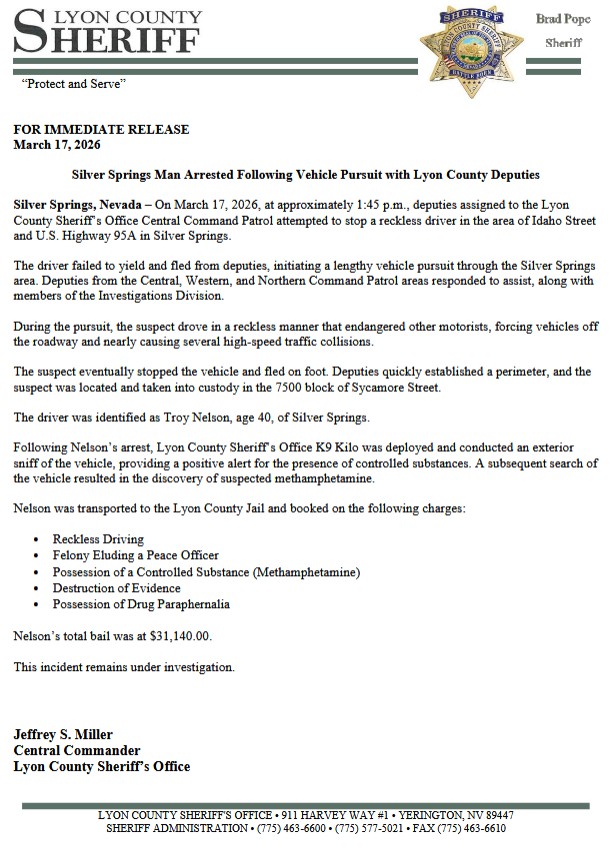 Silver Springs Man Arrested Following Vehicle Pursuit with Lyon County Deputies