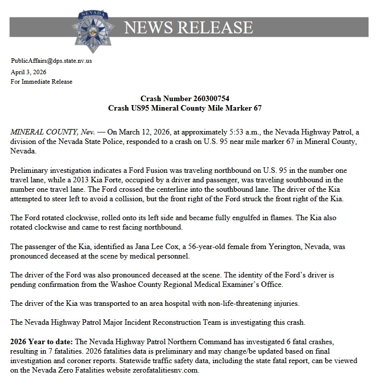 Jana Lea Cox-Stingerie, a resident of Yerington, tragically died on March 12, 2026, following a traffic collision at Walker Lake. A Memorial Service was held for Jana in Schurz, Nevada on March 28, 2026. Jana was a beloved mother, aunt and friend.
