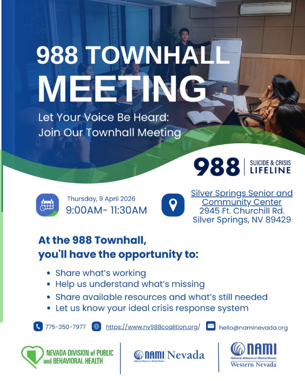 Representatives from the Nevada Department of Public and Behavioral Health, the National Alliance on Mental Illness (NAMI) and NAMI Western Nevada will lead a townhall, providing an opportunity for attendees to provide input on the 988 Suicide and Crisis Lifeline service.