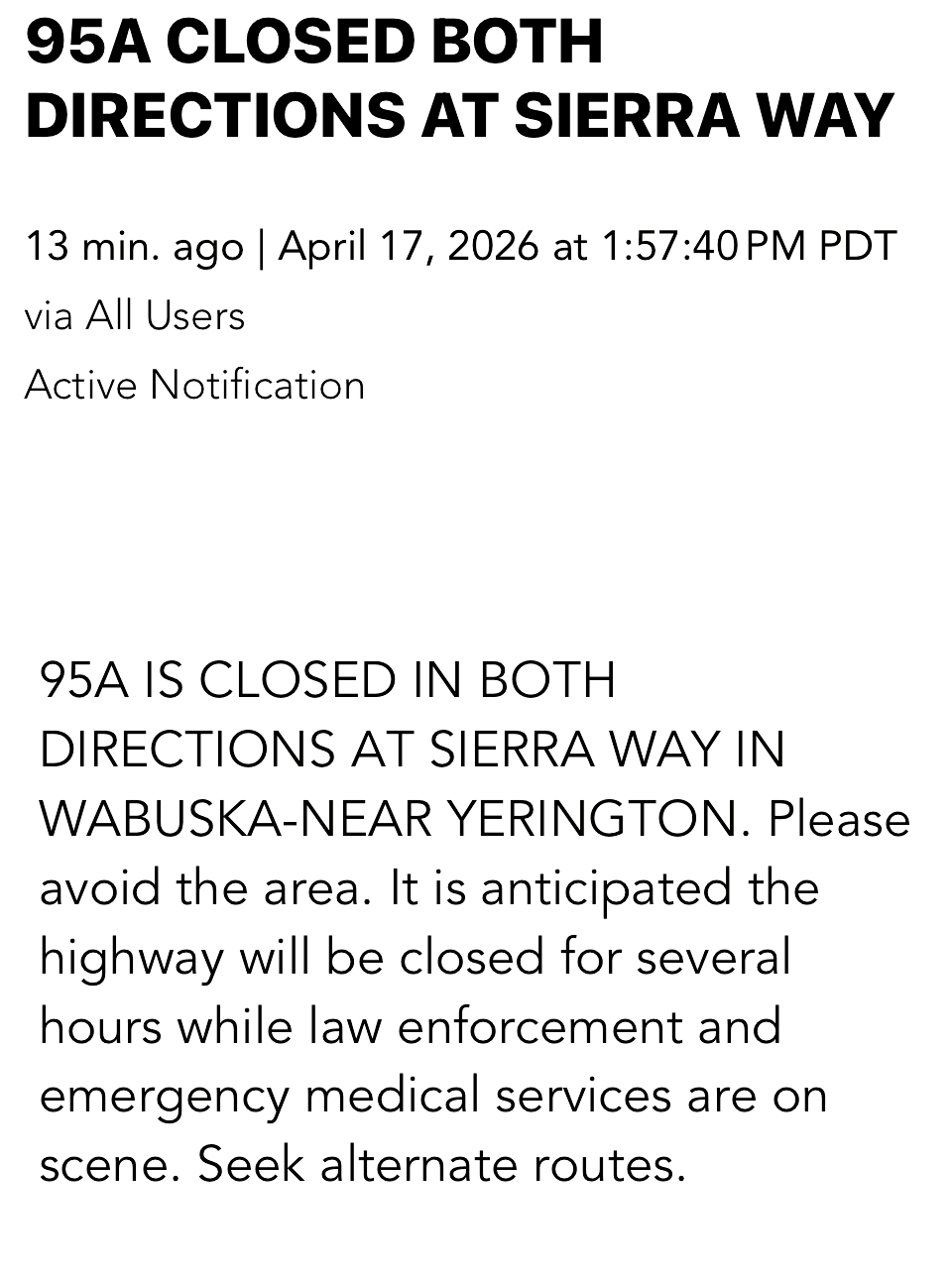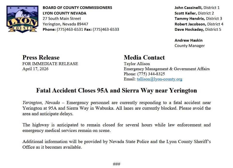 4/17/2026 1:07 p.m.: The Nevada Highway Patrol is currently investigating a fatal crash on US95A near Lyon County mile marker 23.