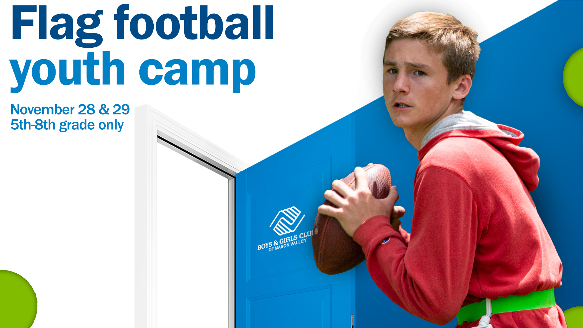 We’re bringing flag football to Mason Valley! Open to youth from every community we serve, this two-day camp will feature drills, teaching the basics, and afternoon scrimmages.