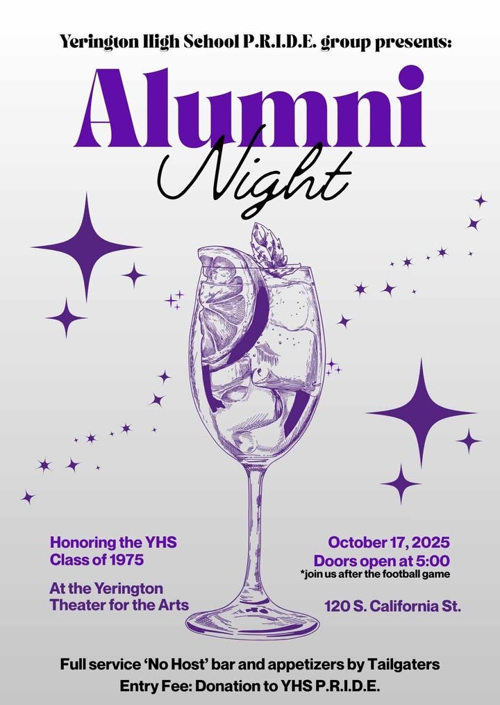 NEW! YHS P.R.I.D.E. Alumni Night. YHS PRIDE is a sports booster and is putting on an Alumni Night Fundraiser at the Yerington Theater for the Arts (120 N. California) featuring a full-service no host bar and appetizers by Tailgaters. Doors open at 5:00 and will be open after the game as well.