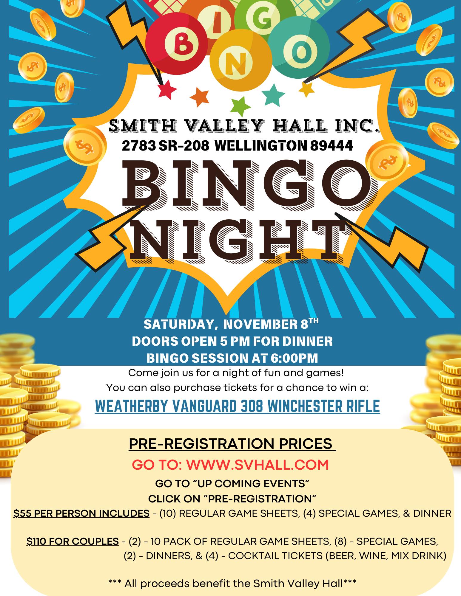 The Smith Valley Hall will be doing a Bingo Night on November 8th.