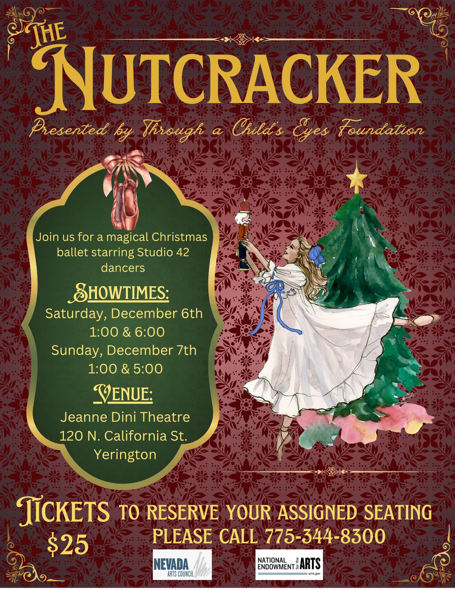 Through a Child’s Eyes Foundation proudly presents our annual production : Hometown Nutcracker! Tickets are on sale now!! This event will take place at the Jeanne Dini Theatre 120 N. California St. – Yerington. Contact us at (775)-344-8300 to reserve your assigned seating! Seating is limited. Experience the magic of the stage, our Royal Raffle and dessert gift box! We are so thrilled to showcase the great talent we have here in our small community!