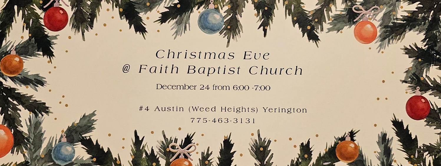 Faith Baptist Church: Come and join us for our Christmas Eve Service on December 24 from 6:00 – 7:00 as we celebrate Jesus birth.